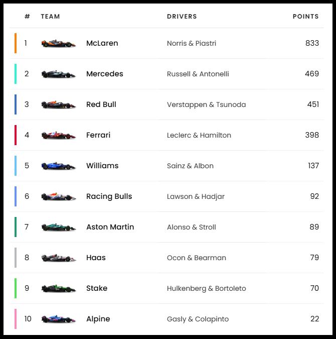 | 13 | 벨기에 GP | 베르스타펜 | 노리스 | 피아스트리 | 안토넬리 | 멕라렌 |