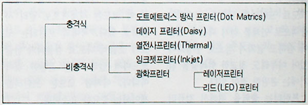 이 그림은 프린터 헤드의 움직임을 기준으로 나눈 분류이다. 여기서 보듯이 프린터는 크게 충격식과 비충격식으로 나뉘어진다. 충격식 프린터는 말 그대로 프린터에서 문자를 찍어주는 헤드라는 부분이 리본을 때려 종이에 인쇄하는 방식 으로 프린터 헤드의 운동을 이용한다. 이것은 타자기의 원리를 생각하면 쉽게 이해할 수 있다.