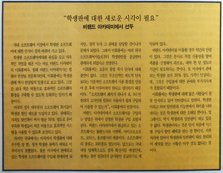 국내에서는 지금까지 로터스와 마이크로소프트사에서 아주 부분적인 할인 제도가 있었지만, 학생 할인 판매에 대해 많이 알려지지 않았기 때문이다. 학생판의 가격은 일반용에 비해 20∼70% 정도까지 할인되며, 각 패키지에 따라 할인폭이 다르게 적용된다.