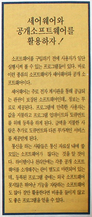 지금까지 대부분의 사용자들이 시스템 구입시 소프트웨어를 공짜로 받았기 때문에 소프트웨어에 대한 정보가 그리 필요하지 않았다. 이제부터는 소프트웨어에 대해 커다란 관심을 갖고, 각종 전문지와 통신 등에 소개되는 여러 정보를 관심있게 눈여겨 보도록 하자.