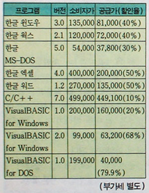 예를 들어 MSDOS 6.0의 경우 5월 31일까지 5만 5천원에 판매되고, 한글 dBASE IV도 할인된 가격에 판매 되고 있다. 하지만 새로운 프로그램은 아직 많은 사람들이 사용하지 않았기 때문에 그 프로그램에 대한 문제점이라든가 버그가 어느 정도이며, 얼마나 사용이 편리한지 등 소프트웨어에 관한 여러가지 사항을 알아볼 수 없다는 단점이 있다.