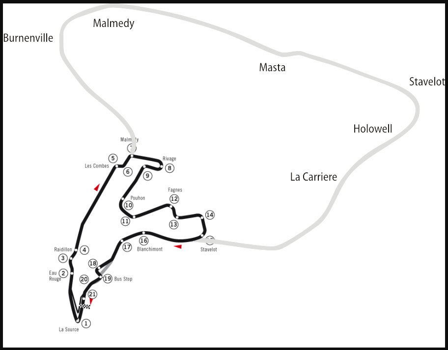스파 서킷은 독일과 가까운 벨기에의 동쪽에 위치해 있으며 1920년 Jules de Thier와 Henri Langlois Van Ophem에 의해 설계되었는데 최초에는 공공도로와 연결해서 사용되었습니다.