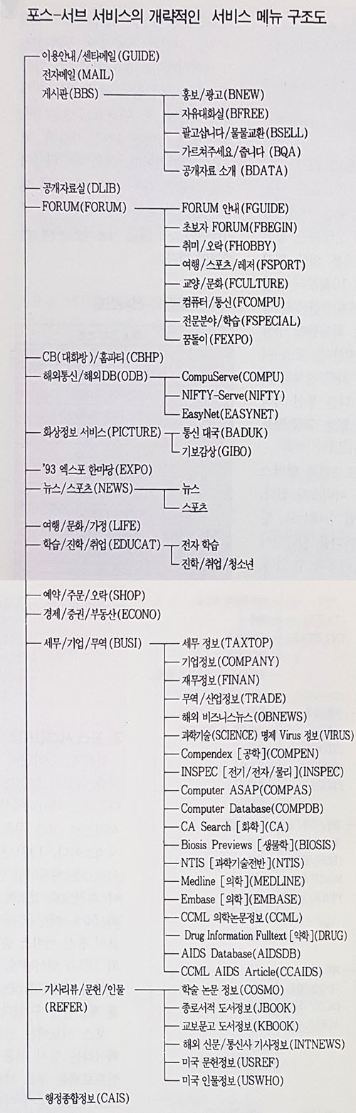 다음에 천리안 서비스 이용자들에게 도움이 될만한 천리안 서비스의 개략적인 서비스 메뉴 구조도를 적어놓았으니 천리안 서비스 이용에 많은 참고 바란다.