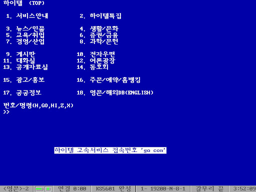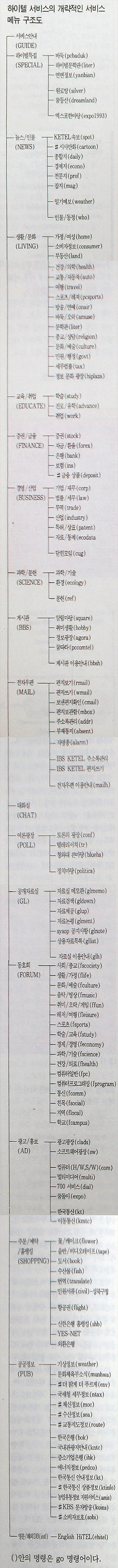 그럼, 주요 서비스 현황의 첫번째로 한국경제신문사의 케텔로 출범하여 국내 PC 통신 대중화의 한 몫을 단단히 하고 있는 한국 PC 통신의 하이텔을 살펴보도록 하자.