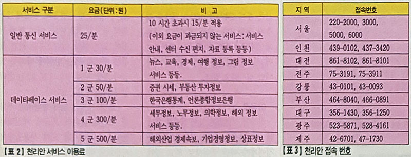 <표 2>에서는 비교적 간단하게 기재한 것으로 이 밖에도 다른 서비스들의 차등 요금 규정이 되어 있는데, 천리안 서비스가 일찍부터 유료화 서비스의 길을 걸어온 탓인지 요금 규정이 매우 짜임새있게 책정되어 있다.