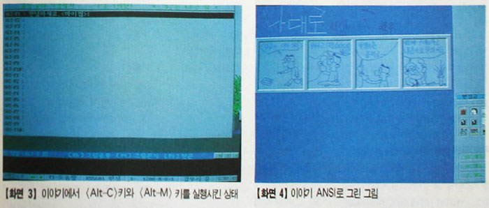 방법은 간단하다. 한 방에 있는 모든 사람이 그림 모드<Alt-N키>로 한 다음, 코드를 보내면 된다. 여기서 <Esc>키는 @ 모양으로 나타난다. 하이텔에서는 별 내용이 아니지만(하이텔에서는 앤시를 쓸 수 있 다), 천리안을 이용하는 사용자에게는 통신에 재미를 더할 수 있는 기능 가운데 하나이다.