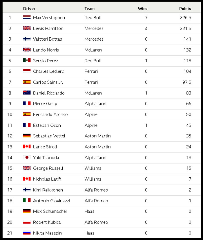 F1 2021 시즌 전체 상황표