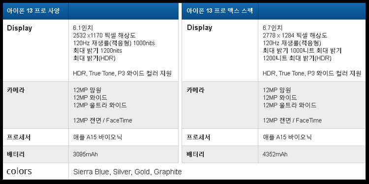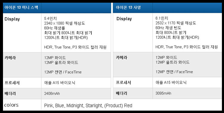 또한 배터리 수명을 늘어났는데 애플측은 아이폰13미니와 아이폰13프로는 이전 모델 대비 배터리 수명이 1.5시간, 아이폰13과 아이폰13 프로 맥스는 배터리 수명이 2.5시간 늘어났다고 밝혔습니다.