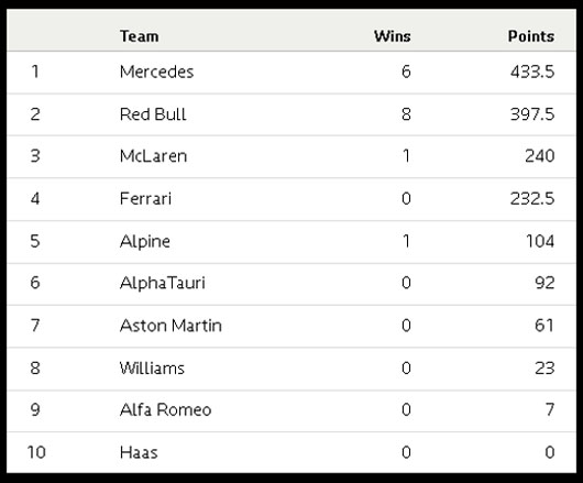 | 15 | 러시아 GP | 노리스 | 해밀턴 | 노리스 | 메르세데스 |