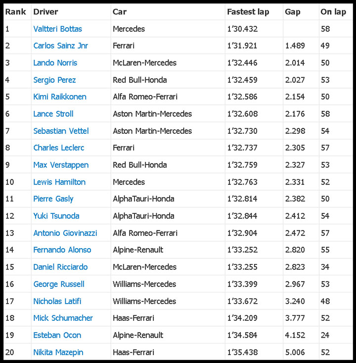메르세데스의 보타스가 이번 시즌 첫 우승이자 자신의 통산 10회 우승을 기록했습니다. 스타트에서 선두 자리를 지킨 보타스는 2위 베르스타펜을 2초에서 3초정도 간격을 꾸준히 유지하다가 레이스 종반에 들어서는 10초이상 간격을 벌리며 별다른 위협을 받지 않고 우승을 거머쥐었습니다. 또한 패스티스트 랩도 기록하며 폴포지션, 우승, 패스티스트 랩 기록까지 모두 가져가게 되었습니다.