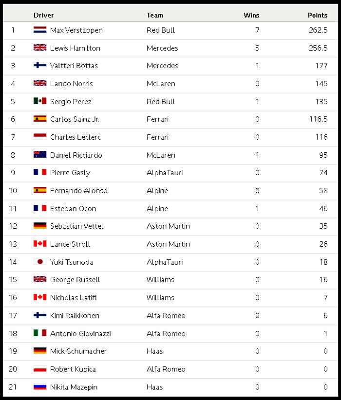 | F1 2021 터키 그랑프리 예선 결과 (F1 2021 Turkey GP Qualifying Results) (0) | 2021.10.09 |