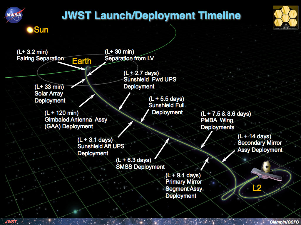 발사 후 12시간 후에 망원경은 자체에 달린 추진기를 점화하여 최종 목적지로 가기위한 여정을 시작하게 되는데 발사 후 대략 2일 반 후에 달을 지나갈 것이며, 이는 아폴로 우주비행사들이 달 궤도에 도달하는 데 걸리는 시간보다 더 빠릅니다.