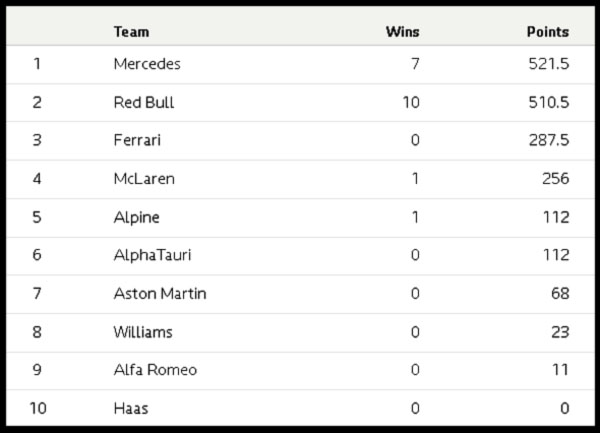 페라리의 르끌레르와 사인츠가 5위와 6위를 차지하면서 리카르도는 리타이어를 하고 노리스가 10위로 1포인트에 거친 멕라렌을 31.5포인트 차까지 벌리면서 팀순위 3위 자리를 차지하고 위한 유리한 위치에 올라서게 되었습니다.
