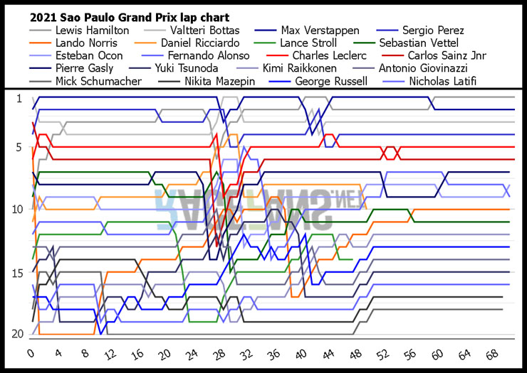 START 베르스타펜 보타스 추월하며 선두. 페라리가 4,5위로 올라섬. 페레즈 보타스 추월하며 2위. 해밀턴 7위까지 올라옴.