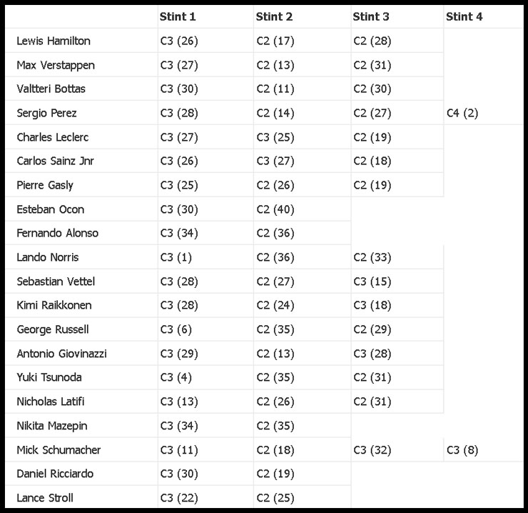 드라이버들의 타이어 교체 전략(C2 하드, C3 미디엄, C4 소프트)
