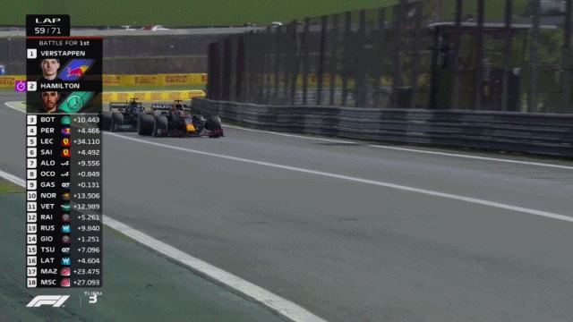 LAP 48 해밀턴 베르스타펜 추월시도 했으나 베르스타펜이 막아내면서 두명모두 트랙밖으로 살짝 나갔다 들어옴.
