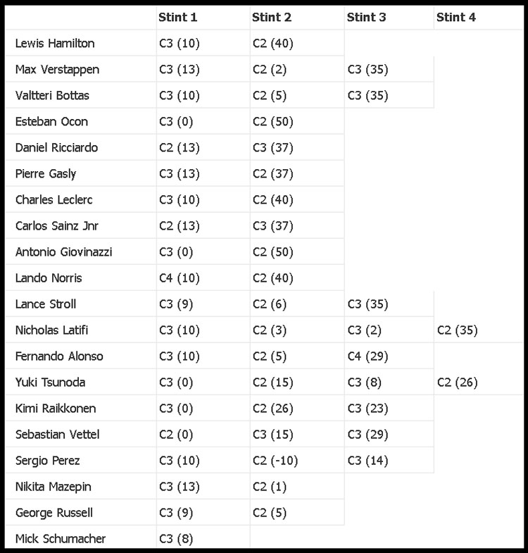 드라이버들의 타이어 교체 전략(C2 하드, C3 미디엄, C4 소프트)