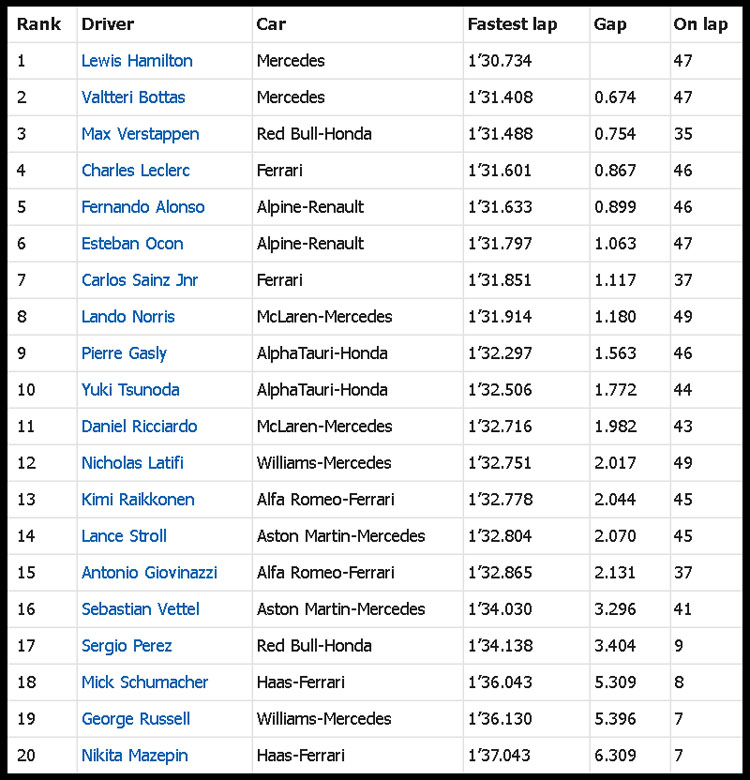 해밀턴 우승. 베르스타펜 2위. 보타스 피니쉬 라인 앞에서 오콘 추월하며 3위.