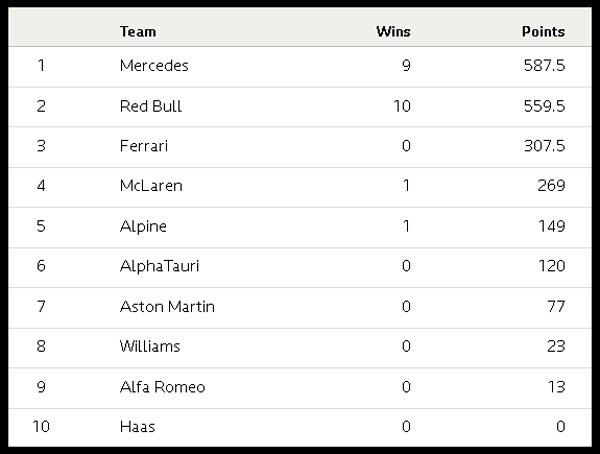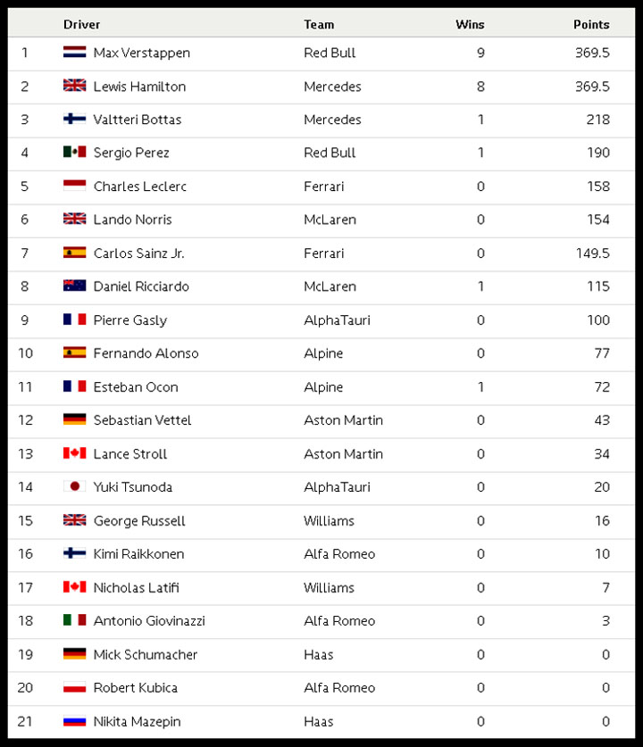 해밀턴과 베르스타펜은 이번 그랑프리에서 포인트가 동점이 되었고 결국 최종전 아부다비 그랑프리에서 월드 챔피언이 가려지게 되었습니다. 팀순위에서는 페레즈가 리타이어 하면서 메르세데스가 레드불과의 격차를 28포인트까지 벌리면서 확실히 유리한 고지에 올라섰습니다