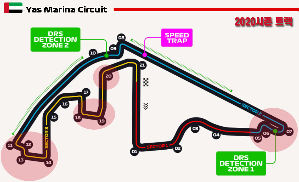 2021시즌에는 트랙의 몇가지 변화가 있는데 사진에서 보듯이 5번에서 7번까지 3개의 코너였던것이 1개의 헤어핀으로 바뀌었으며 11번부터 14번까지 4개의 코너가 부드러운 형태를 완만한 곡선 코너로 바뀌었습니다.