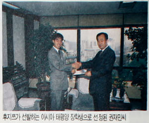 한국 후지쯔는 후지쯔 아시아 태평양 장학생으로 권재민씨(서울대 경영학과 졸업)를 선발, 6월 28일 장학증서를 전달했다. 일본 후지쯔가 85년부터 창립 50주년 기념 사업의 하나로 실시한 이 장학제도는 아시아 지역 국가간의 상호이해 증진과 공동 협력을 위한 것이다.