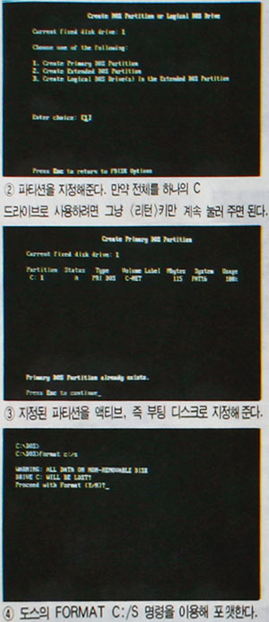 변경된 CMOS 내용을 기록하고 빠져나온 뒤에 다시 A: 드라이브로 부팅한 다음 새롭게 설치한 하드디스크의 파티션을 나누어야 한다.