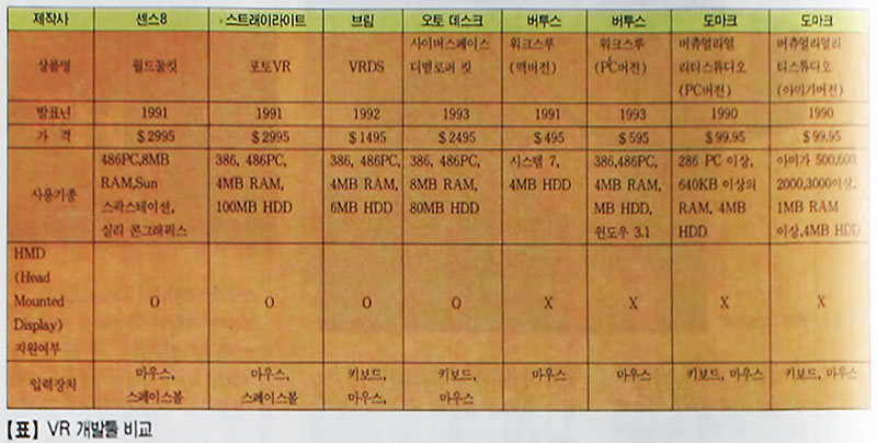 가상현실 소프트웨어 개발툴을 구입할때에는 맨 먼저 어떠한 PC 또는 워크스테이션에서 실행시킬 것인지를 정해야 한다. 그것이 정해지면 다음은 가격이 중요하다. 현재까지 판매되고 있는 제품은 99.95달러부터 수천달러에 이르기까 지 다양한 가격대를 형성하고 있다.