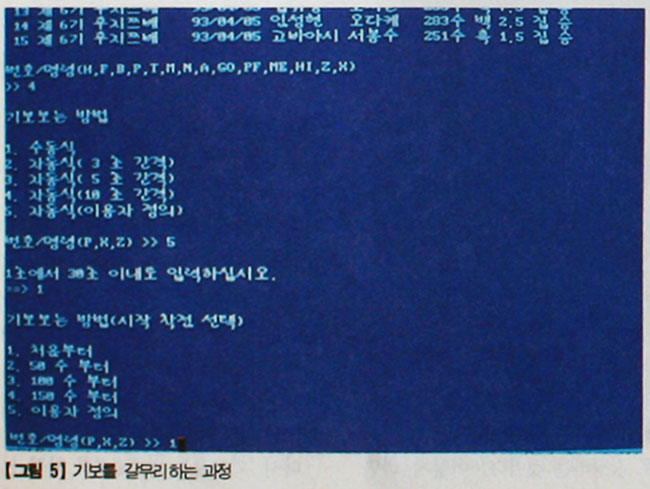 기보를 갈무리해서 오프라인으로 읽는 방법을 하이텔을 기준으로 설명하겠다. (천리안도 방법은 비슷하다). 먼저 기보 감상 리스트에서 원하는 기보를 선택하면 '기보보는 방법'을 물어온다. 이 때, '5.자동식(사용자 정의)'을 선택하고 이어서 '1초에서 30초 이내로 입력하십시오.'라고 물어오면 '1'을 입력한다.