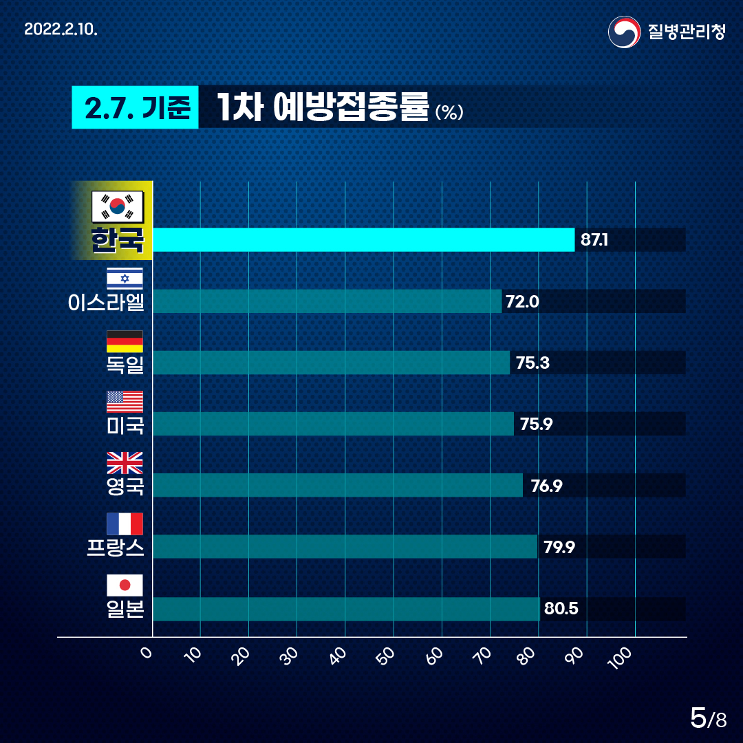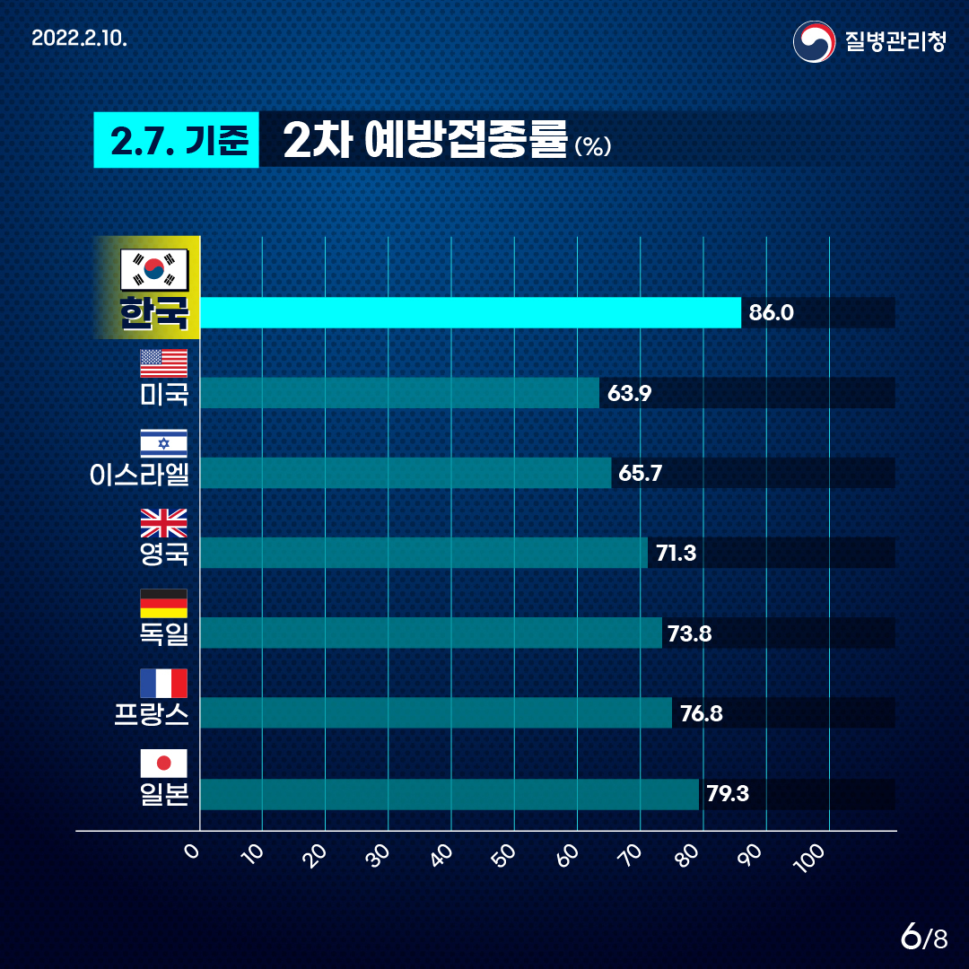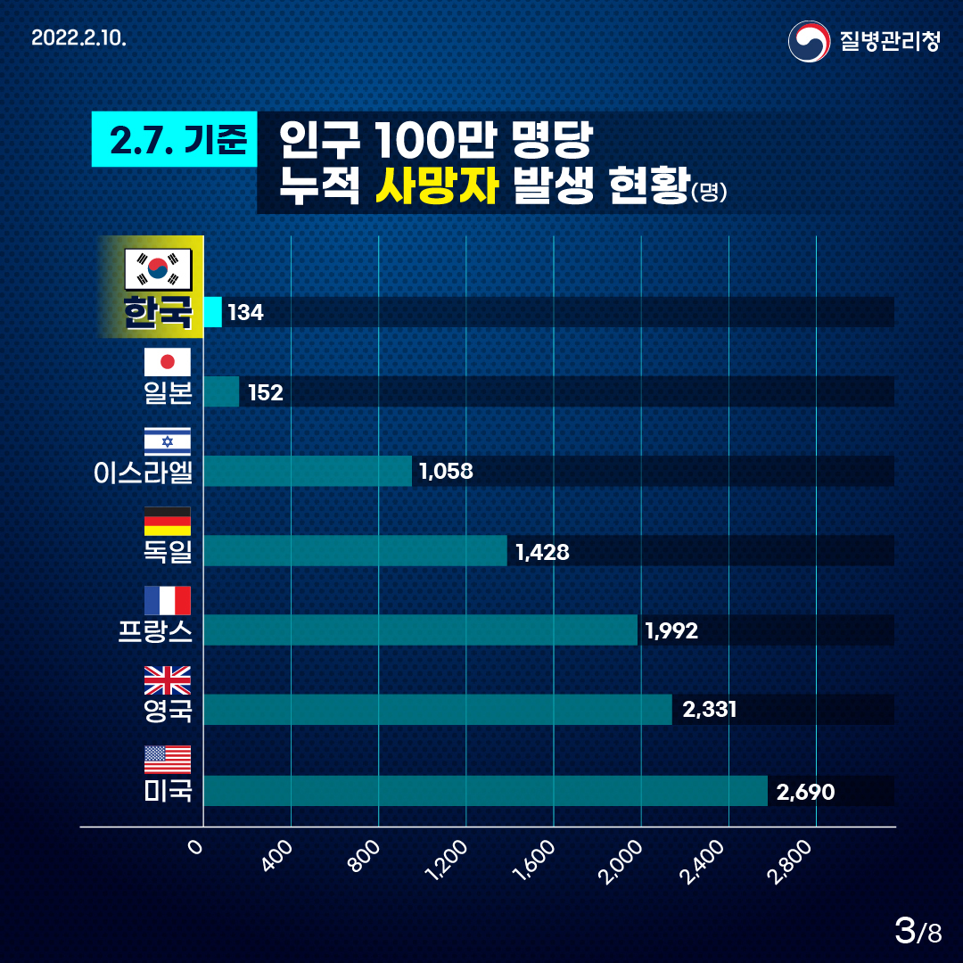 발생 초기 치명율이 높았을때 그 어떤 나라보다 철저한 방역을 통해 현재까지 100만명 누적 감염자 및 100만명당 누적 사망자가 최저 수준을 유지하게 된 듯 하며 또한 우리 국민들의 방역수칙 준수및 높은 예방접종율이 한 몫을 한것으로 보입니다.