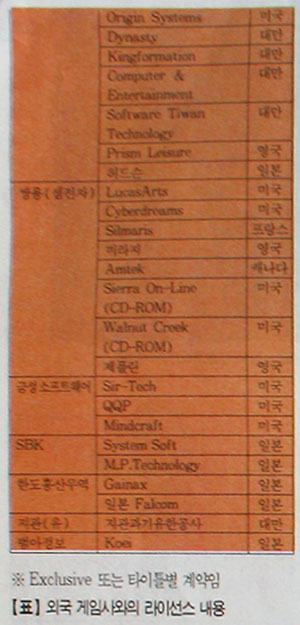 그 다음은 SKC로 마이크로 프로즈 (MicroProse), 오리진 시스템즈(0rigin Systems), Kingformation, 허드슨 등 모두 21개사에 이르며 최근 PC 게임 시장에 뛰어든 쌍용은 루카스 아츠(LucasArts) 등과 이미 계약을 마친 상태이다.