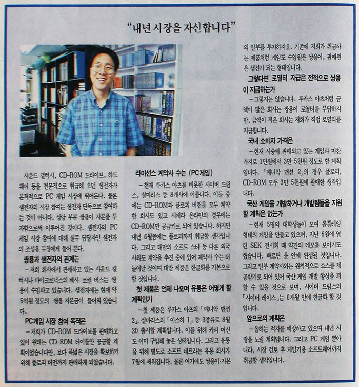 이에 대해 소프트타운의 신근영 사장은 "저희 회사 올 매출액 목표 가운데 1/10인 10억 정도를 게임 소프트웨어 매출로 계획하고 있는데, 지금으로서는 약 8억 정도의 매출을 올릴 것으로 예상합니다. 좋은 게임의 경우 기본적으로 4~5천 카피는 소화할 수 있는데, 작년에는 2~3천 카피 정도에 머물렀습니다. 이처럼 수요가 늘어난 것은 게임 수요층의 저변 확대와 게임 소프트웨어 취급점이 그만큼 늘었기 때문으로 봅니다. 앞으로 2~3년 동안 PC 게임 시장은 연간 150~300% 정도 성장할 전망"이라고 설명하면서 소프트타운의 외국사와의 라이선스 모색 가능성을 비치기도 했다.