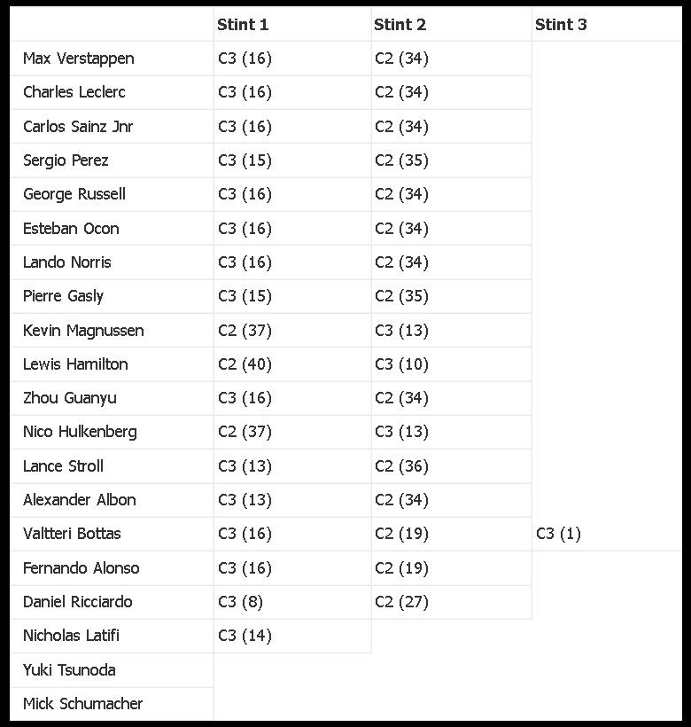 드라이버들의 타이어 교체 전략(C2 하드, C3 미디엄, C4 소프트)
