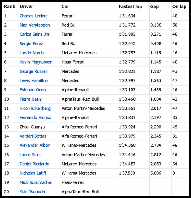 FINAL LAP 르끌레르 패스티스트 랩. 베르스타펜 우승. 르끌레르 0.54초 차이로 2위. 사인츠 3위. 오콘 노리스 추월하며 6위.