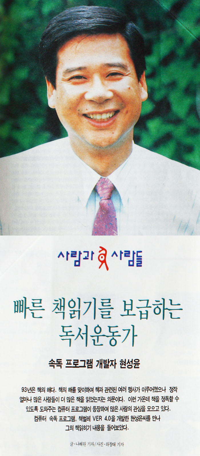 컴퓨터에서의 빠른 책읽기 연습으로 많은 사람에게 독서를 권장하고자 노력하는 사람은 바로 40대의 독서광인 현성윤씨다. 그가 처음 독서 권장 운동과 연관을 맺게된 것은 국민 독서운동 본부에서 뜻있는 사람들과 함께 일을 하면서 부터이다.