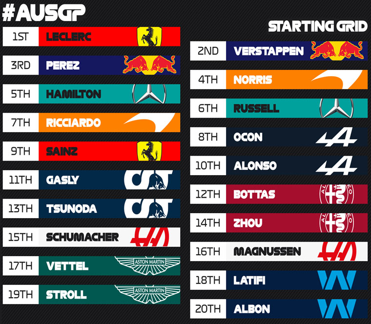| F1 2022 - 호주 그랑프리 예선 결과 (F1 2022 Australia GP Qualifying Results) (0) | 2022.04.09 |