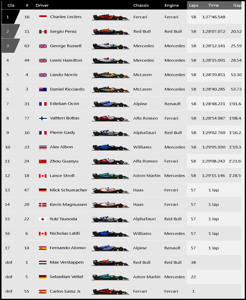 페라리의 르끌레르가 경쟁자가 리타이어하는 사이 무난하게 우승을 가져가며 벌써 시즌 2승째를 챙겼습니다. 르끌레르는 두 번의 우승과 한번의 2위로 71포인트를 쌓아 2위와 34포인트 격차를 벌리며 챔피언십 경쟁에서 유리한 고지를 점령했습니다. 반면에 팀 동료인 사인츠는 9그리드에서의 출발이 부담이 되었는지 2랩에서 믹슈마허를 추월하려다 트랙밖으로 밀려난 후 복귀하지 못하고 그대로 리타이어 하고 말았습니다.