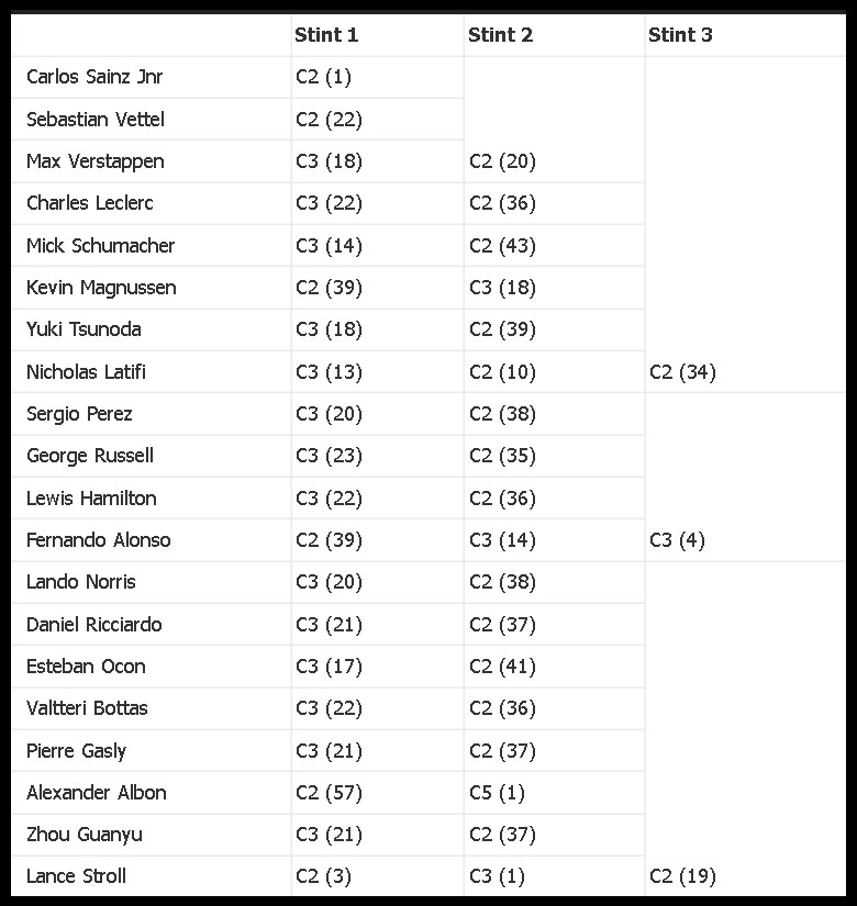 드라이버들의 타이어 교체 전략(C2 하드, C3 미디엄, C5 소프트)