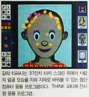THINK 파티에서는 까치 선생, 매직 스크린, 장애인 훈련 게임 등 여러 종류의 소프트웨어들이 설치되어 참가자가 직접 조작해 볼 수 있도록 했다. 특히 전시관에서 눈길을 끌었던 것은 첨단의 컴퓨터 환경과 전통의 어울림이었다.