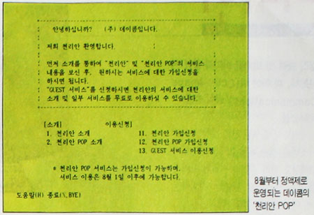 데이콤은 8월 1일부터, 정액제로 운영되는 '천리안 POP' 서비스를 시작했다. 현재 데이콤이 제공중인 PC 통신 서비스, '천리안'은 종량제 요금 구조로 되어 있어 사용자들이 천리안 이용에 경제적 부담을 느끼고 있는 점을 감안, 천리안과는 별도로 정액제로 운영하는 '천리안 POP' 를 개발했다.