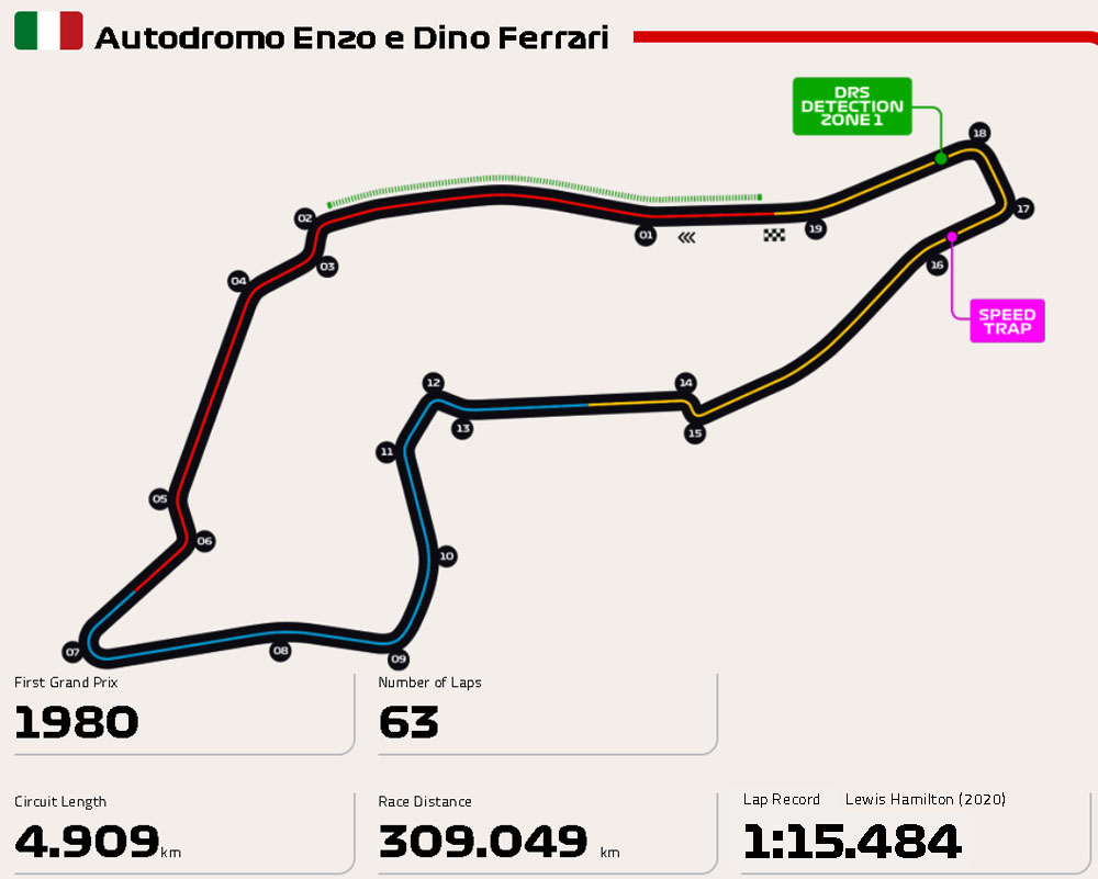 이몰라 서킷은 F1서킷중에서 시계 반대 방향으로 달리는 몇 안되는 서킷 중 하나이며 이 서킷의 공식적인 이름은 페라리의 설립자 Enzo Ferrari 와 그의 아들 Alfredo Ferrari 의 이름을 따서 명명되었습니다만 이몰라 서킷으로 더 유명합니다.