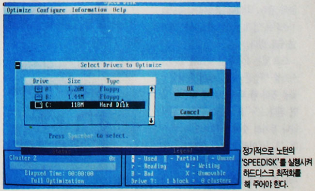 하드웨어 청소를 마치면 소프트웨어적으로 도스의 CHKDSK/F, 노턴의 스피드 디스크(SPEED DISK), MS DOS 6.0의 디스크 옵티마이저 (Disk Optimizer) 등을 사용해 하드디스크 최적화 작업을 해 준다.