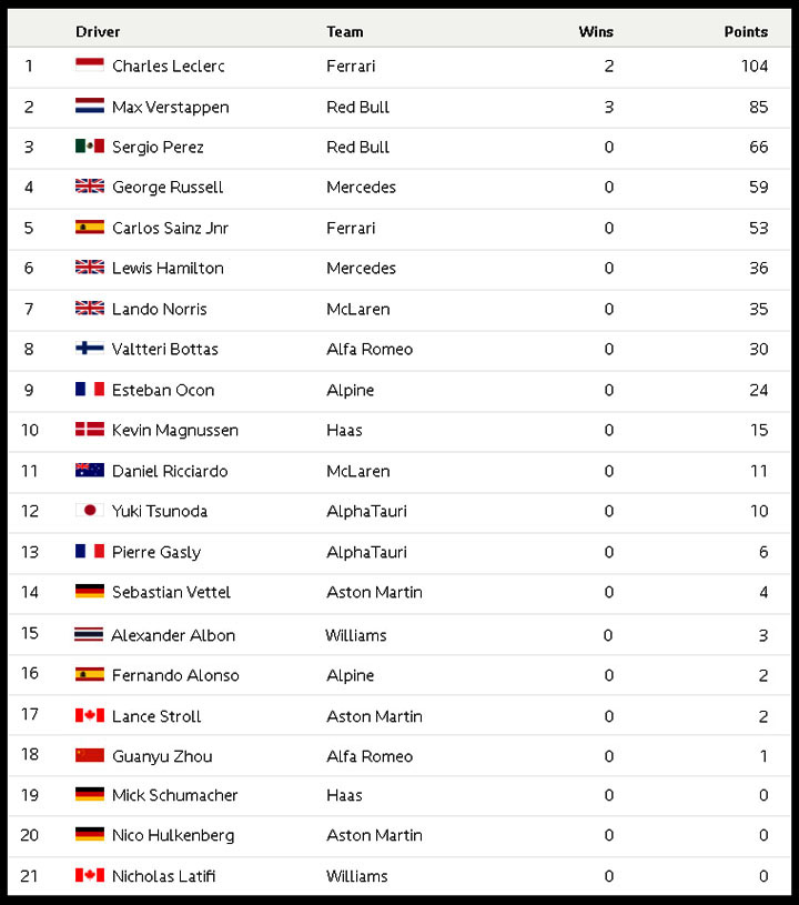 현재순위 베르스타펜 르끌레르 사인츠 페레즈 러셀 보타스 해밀턴 오콘 알론소 스트롤
