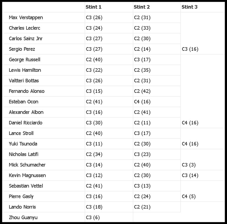 드라이버들의 타이어 교체 전략(C2 하드, C3 미디엄, C4 소프트)