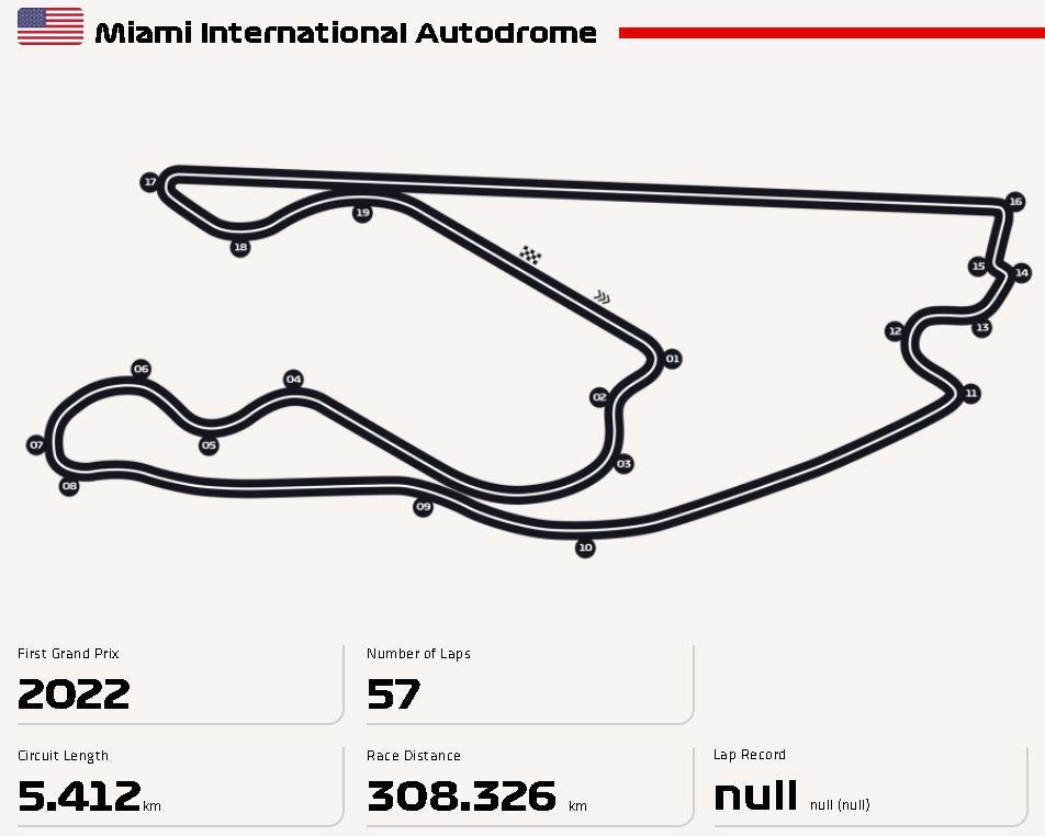 마이애미 국제 오토드롬 (Miami International Autodrome)은 미국의 플로리다주 마이애미 가든스의 마이애미 교외에 있는 하드록 스타디움과 그 주변에 특별히 설계된 임시 서킷 입니다. 트랙의 길이는 5.412km이며 19개의 코너가 있으며 예상 평균 속도는 약 223km/h 입니다.
