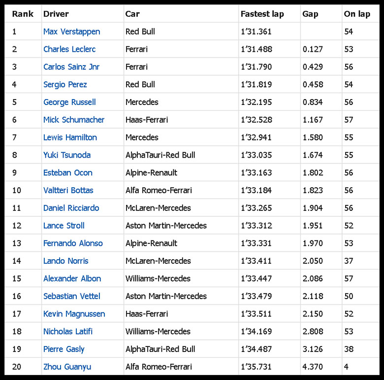 LAP 54 베르스타펜 패스티스트 랩. 해밀턴 러셀 추월하며 5위. 믹슈마허와 베텔 충돌 베텔차량이 스핀하며 9위에서 16위까지 순위 떨어짐.