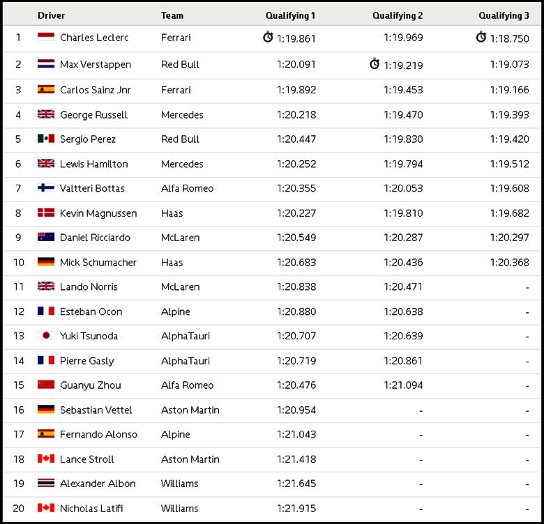 르끌레르가 Q3 첫 기록 도전에서 스핀하며 기록을 내지 못하고 베르스타펜이 좋은 기록으로 잠정 폴 포지션을 가져가는듯 했지만, 르끌레르가 마지막 도전에서 베르스타펜을 기록을 넘어 1위를 차지했습니다.