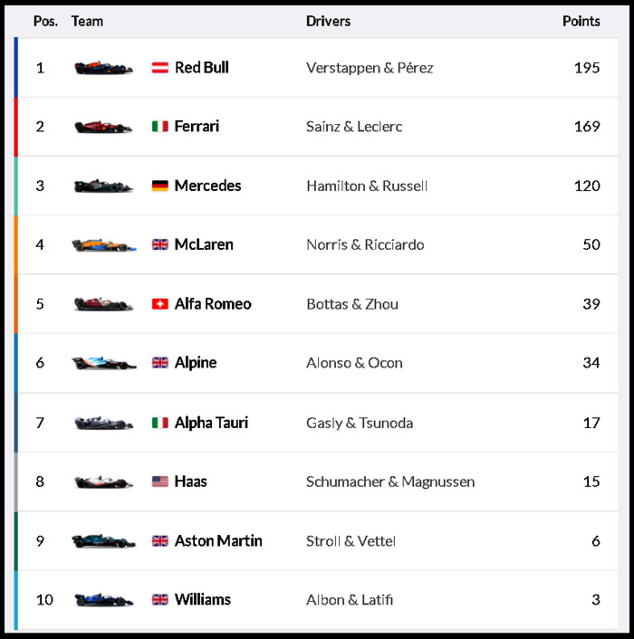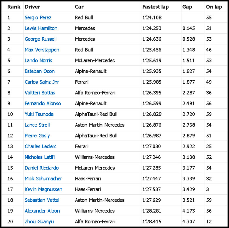 그러나 르끌레르가 차량 문제로 리타이어 하고 선두를 달리던 페레즈의 양보로 선두를 이어 받은후 부터는 순항하며 우승을 차지했습니다. 또한 레드불은 페레즈가 2위를 하면서 원투피니쉬로 레이스를 마감하면서 이번 그랑프리에서 44포인트를 획득 페라리를 재치고 팀 순위에서도 선두로 나서게 되었습니다.