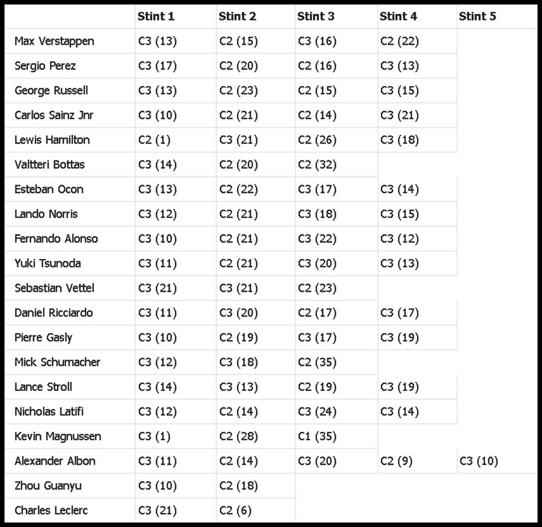 드라이버들의 타이어 교체 전략(C1 하드, C2 미디엄, C3 소프트)