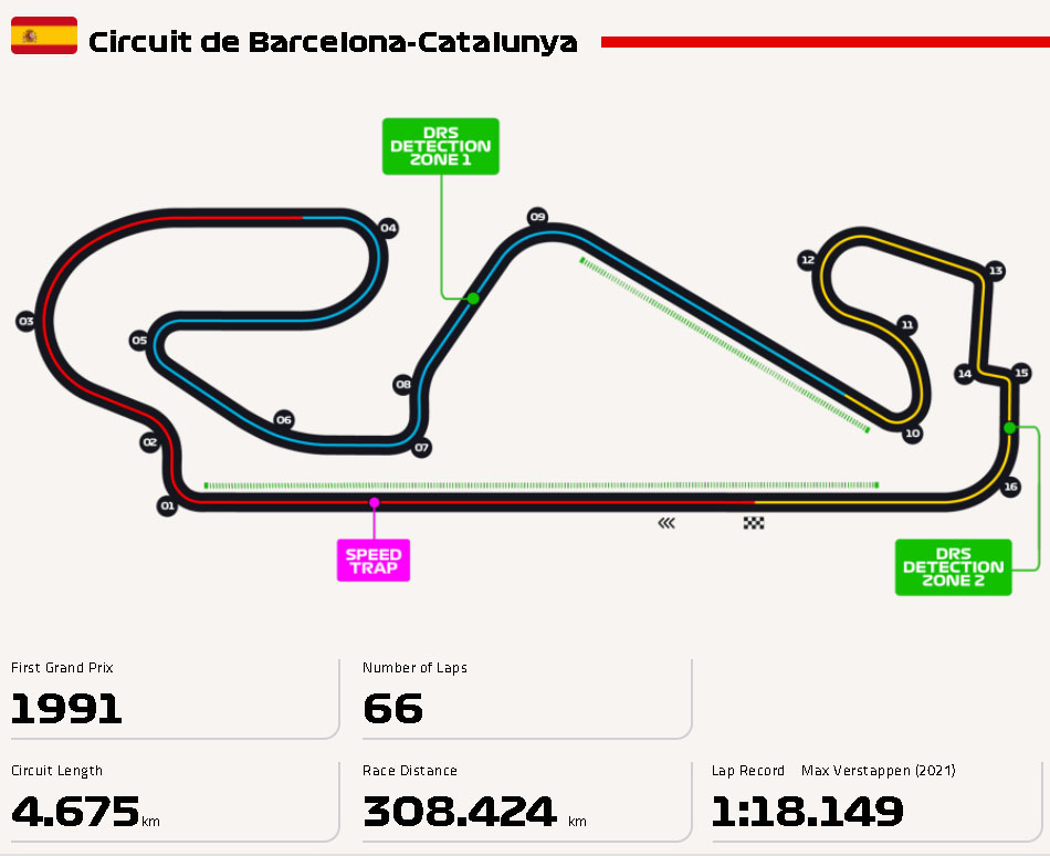 정식 명칭은 Circuit de Barcelona-Catallunya 이며 이 서킷은 1991년에 지어진 후 그해 바로 F1 스페인 그랑프리가 개최되었습니다. 스페인 카탈루니아 몬트멜로에 위치해 있으며 4.675km의 길이로 16개의 코너로 구성되어 있습니다.