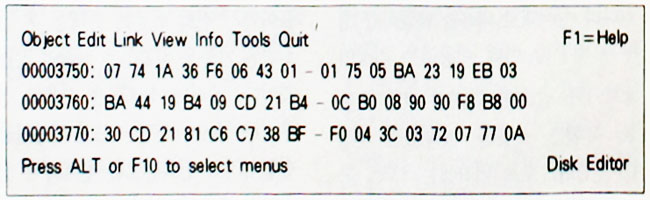 디스크 에디터의 툴에 있는 FIND 명령을 사용하여 사각형 안에 있는 'B0 08 CD 21 F8' 이란 내용을 찾는다. 그런 후 'CD 21'을 '90 90'으로 바꾼 후 저장한다.